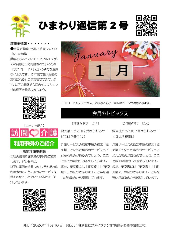 ●このたび『ヘルパーステーションひまわり』におきましては、「ひまわり通信」(不定期)を発行する運びとなりました。本通信の内容は全て2024年6月23日より開始しました公式サイト「ヘルパーステーションひまわり」の投稿内容から抜粋したものです。